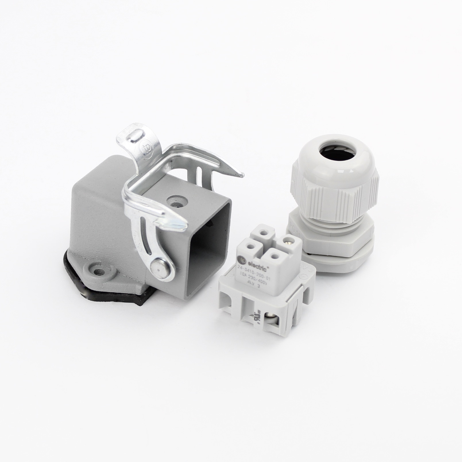Industriesteckverbinder - Sockelgehäuse gewinkelt mit offenem Boden + Buchse 4 Polig 10A - Metall